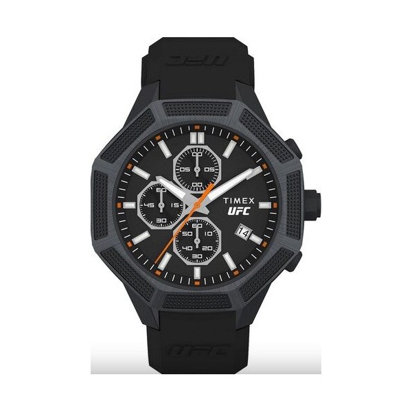 Reloj Timex UFC. Official Timekeeper Of UFC. KING Cronógrafo, Caja 45mm de acero negra con circonitas, Correa de silicona negra , Esfera negra y Resistencia 5ATM.