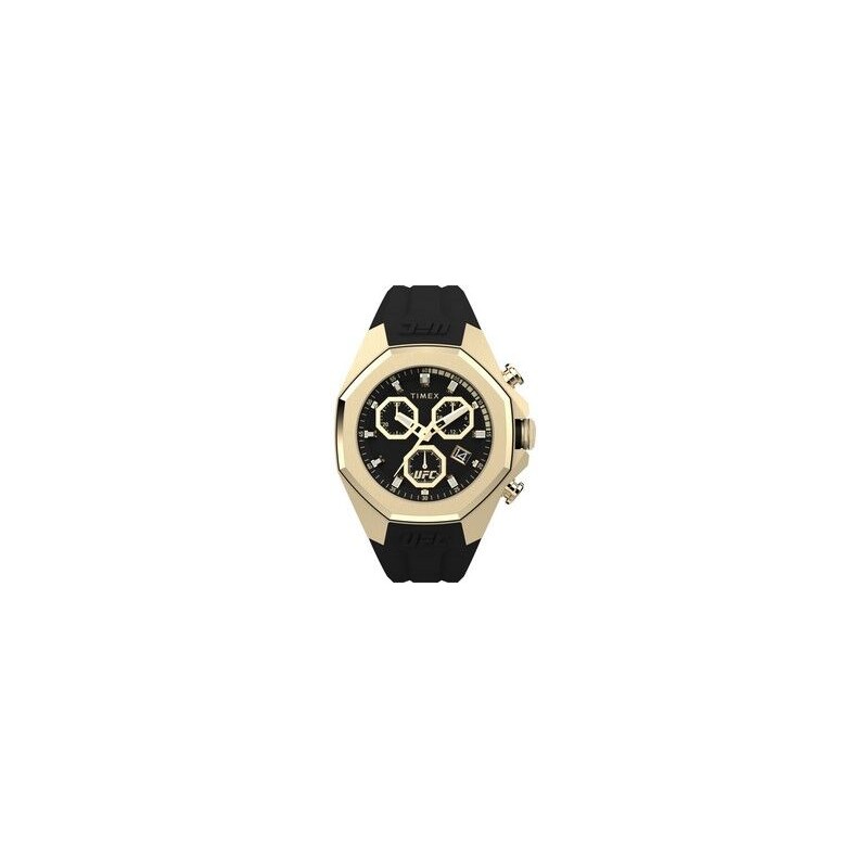 Reloj Timex UFC. Official Timekeeper Of UFC, PRO CHRONOGRAPH, Caja de acero dorada de 45mm, Correa de silicona negra , Esfera negra y Resistencia 10ATM.