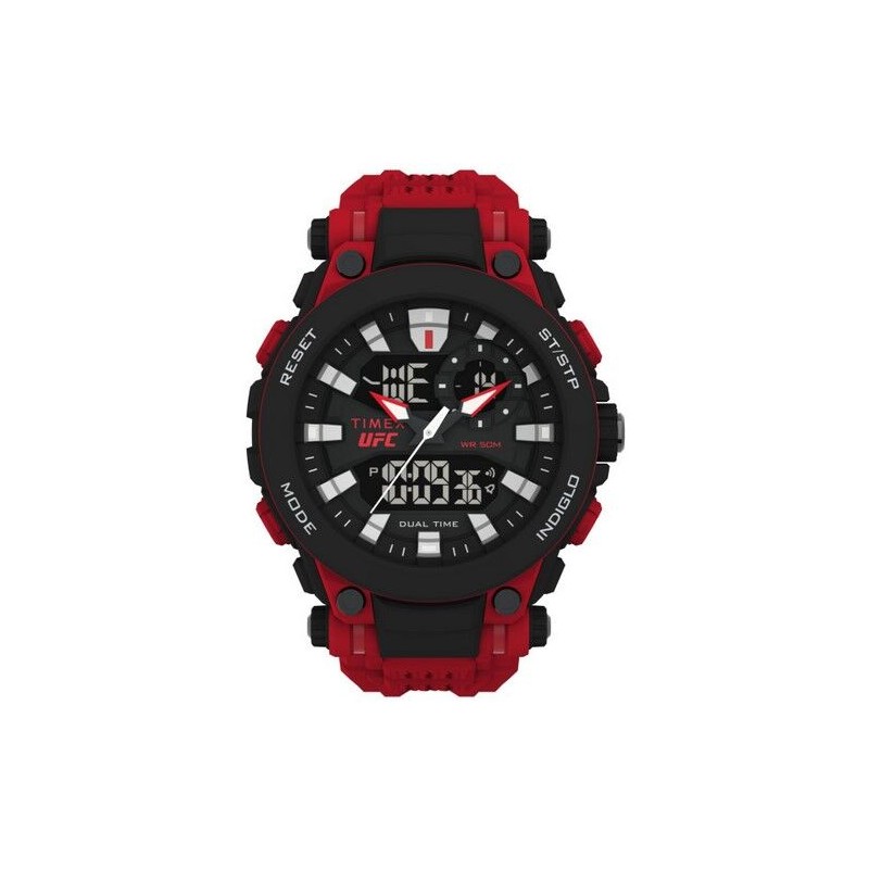 Reloj Timex UFC. Official Timekeeper Of UFC. IMPACT.Caja 50mm de resina negra y roja, Correa de silicona roja, Esfera negra y Resistencia 5ATM.
