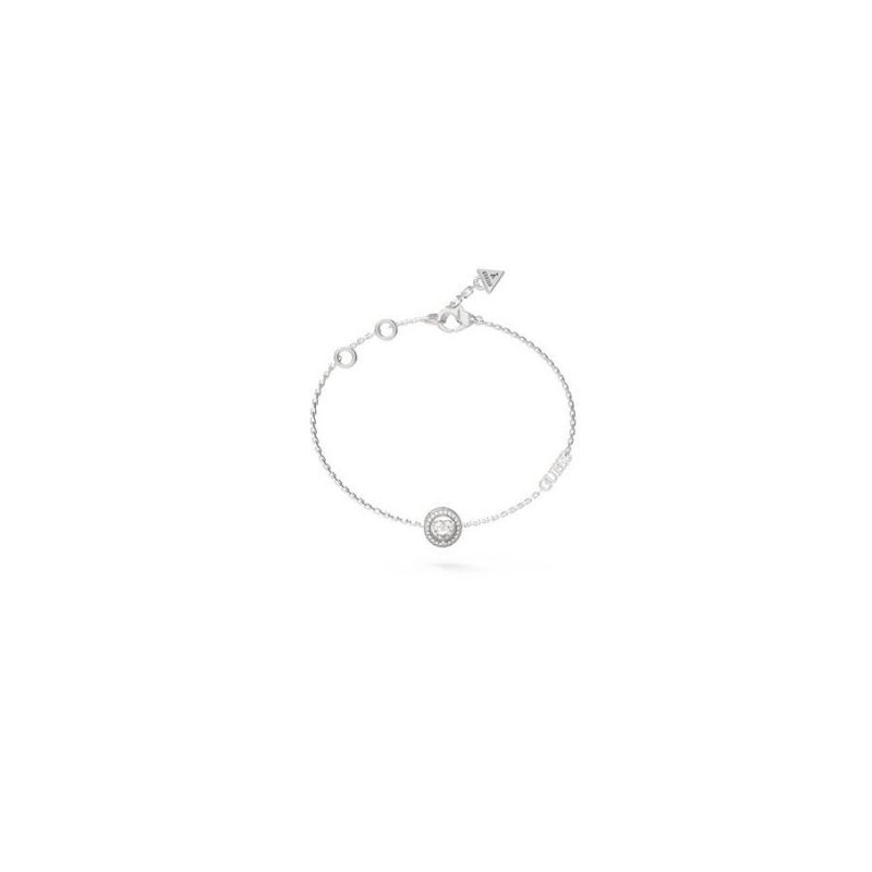 Pulsera Guess para mujer de la colección M'AMA NON M'AMA fabricada en acero inoxidable compuesta por una elegante cadena que cuenta con la palabra GUESS y un abalorio circular formado por circonitas blancas. Su cierre es de mosquetón ajustable mediante cadena extensible.