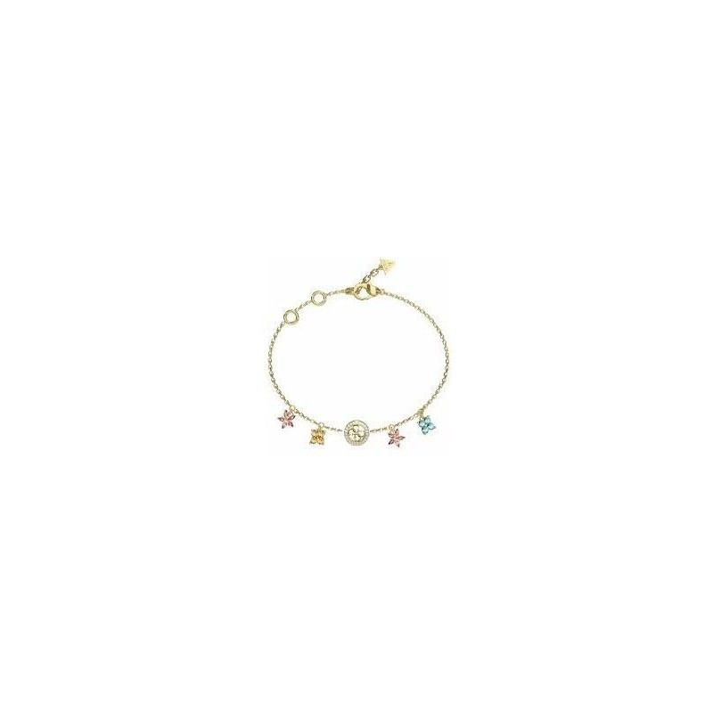 Pulsera Guess Mujer Secret Garden Acero Dorado Con Logo 4G y Flores En Circonitas De Colores Colgantes Ref: JUBB06033JWYGMCS