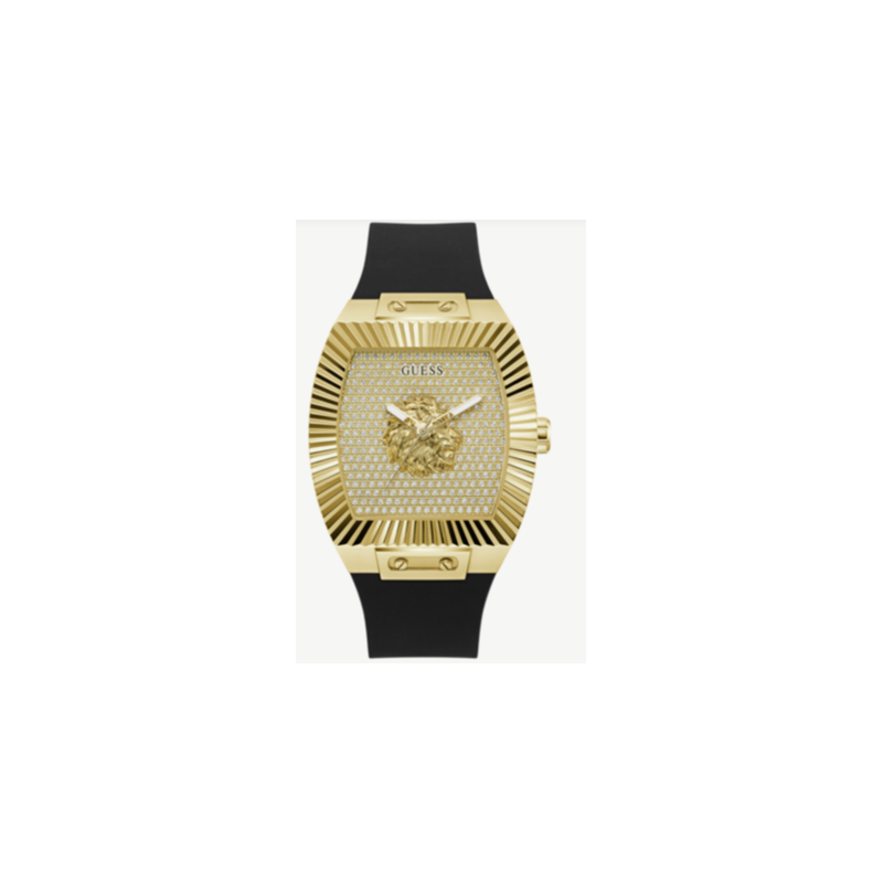 Reloj Guess Caballero Phoenix Correa Silicona Negro Caja Rectangular Esfera Champagne Cabeza De León Dorado 43mm Ref: GW1066G2