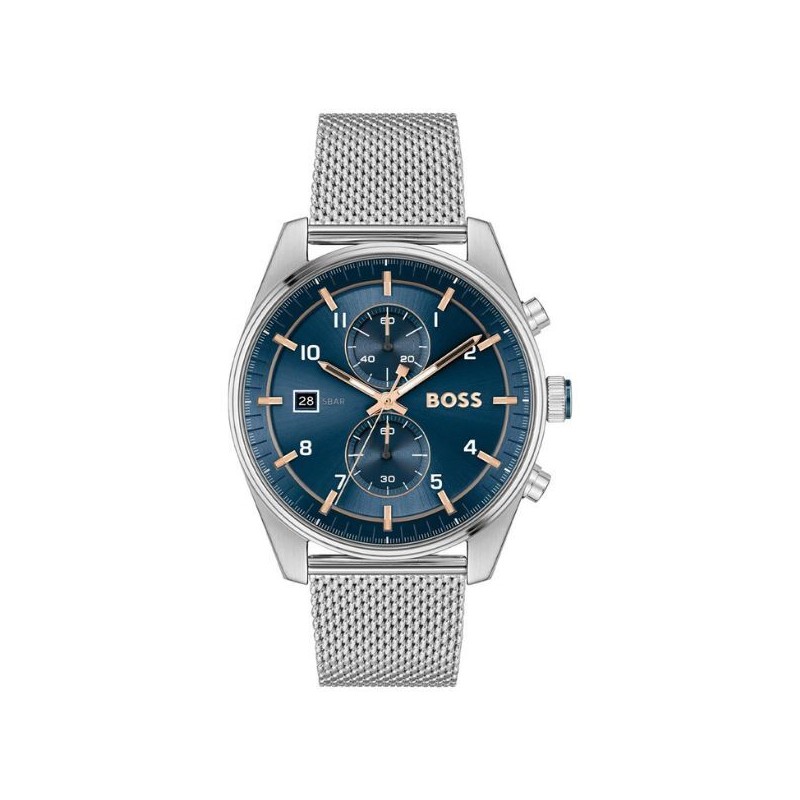 Reloj Boss Caballero Skytraveller Malla Milanesa Acero Esfera Azul Cronógrafo 44mm Ref: 1514149
