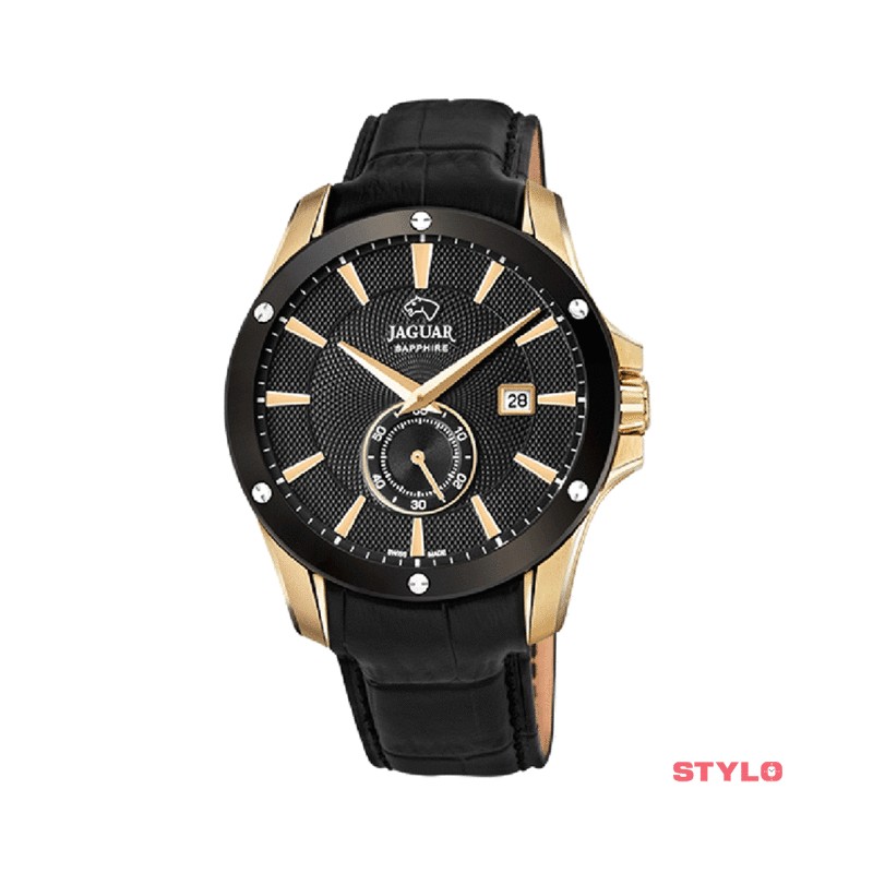 Reloj Jaguar Acamar Caballero Suizo Piel Negra Esfera Negra Dorado 44mm Ref: J881/1