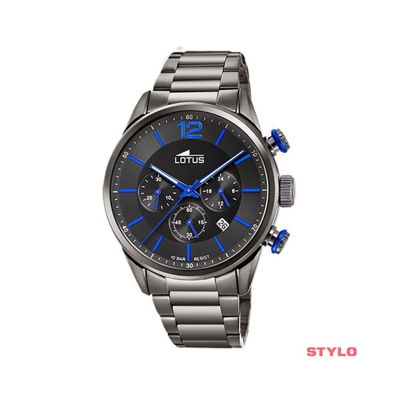 Reloj Lotus Chrono Acero Ip Gris Esfera Negra Con Detalles En Azul Cronógrafo 43mm Ref: 18686/3