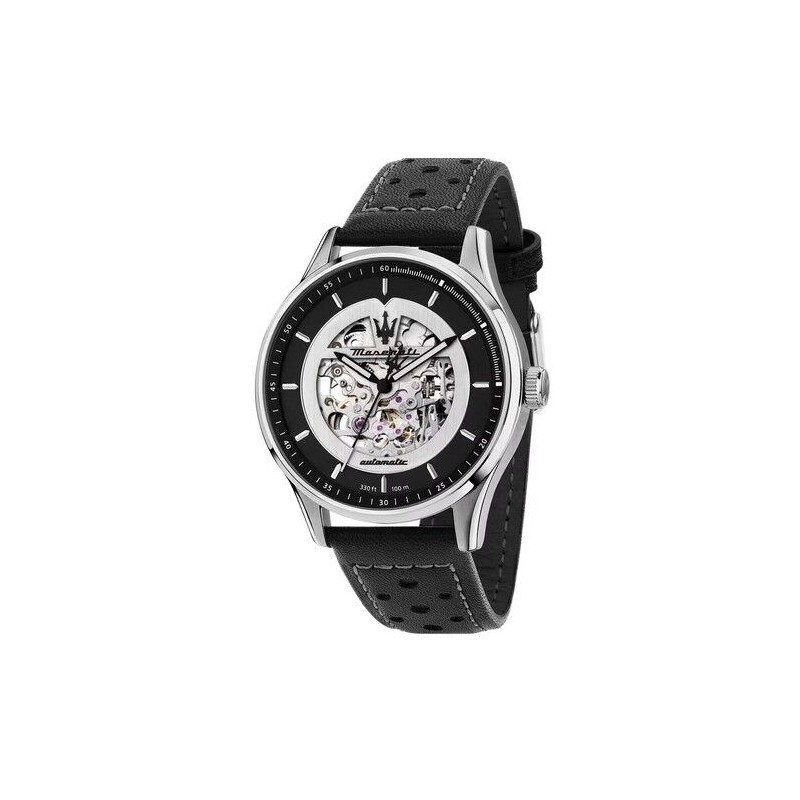 Reloj Maserati Caballero Sorpasso Automático Piel Negra Acero Esfera Negro/Plata Open Heart Cristal Zafiro 42mm Ref: R8821124004