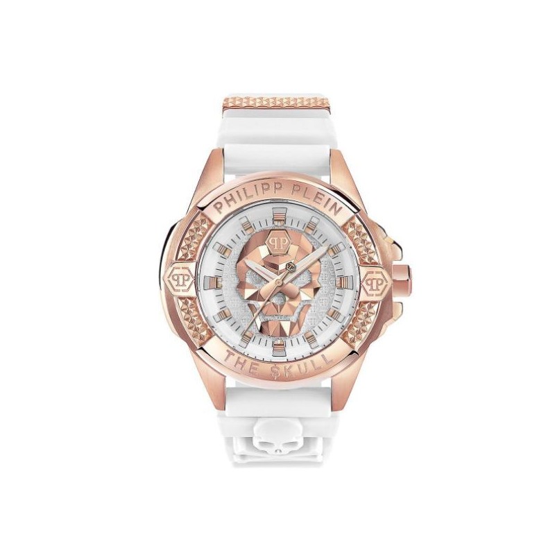 Descubre el Philipp Plein PWAAA2224 de la colección THE $KULL en TicTacArea.com. Con correa de silicona blanca y caja IP Rose Gold, este reloj unisex de 44 MM es resistente al agua hasta 5 ATM. ¡Hazlo tuyo hoy!
