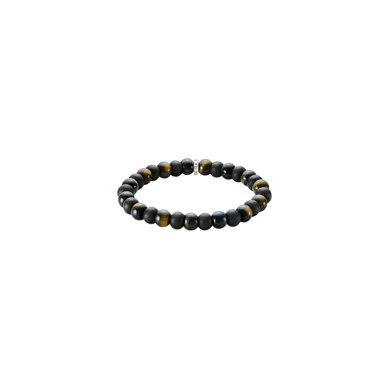 Déjese inspirar por la fuerza y el resplandor de esta pulsera. Combina beads de obsidiana negra mate con beads de ojo de tigre de oro azul pulido. Todas tienen un tamaño de 9 mm. Un anillo con el logotipo de plata reciclada y ennegrecida con el grabado THOMAS SABO añade un elegante acento. La pulsera es elástica y
