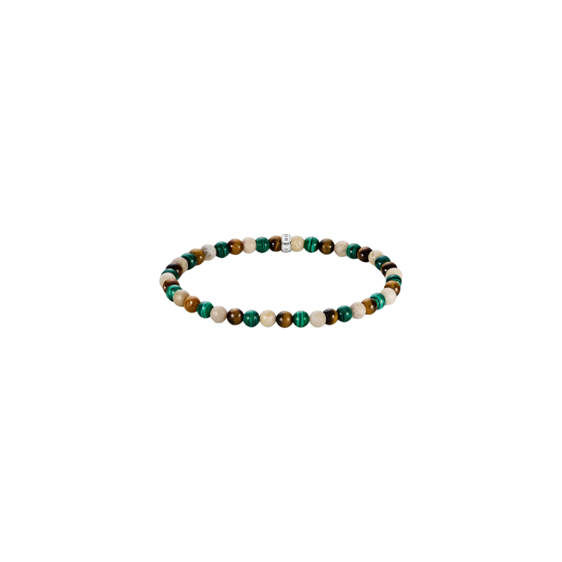 Déjese inspirar por la energía positiva que irradia esta pulsera de jaspe margarita, malaquita de imitación y ojo de tigre. Los tonos verdes y terrosos de las beads de 5 mm reflejan el entusiasmo por la vida y la conexión con la naturaleza. Un anillo con el logotipo de THOMAS SABO grabado en plata ennegrecida reciclada da un toque elegante a la pulsera de piedras.