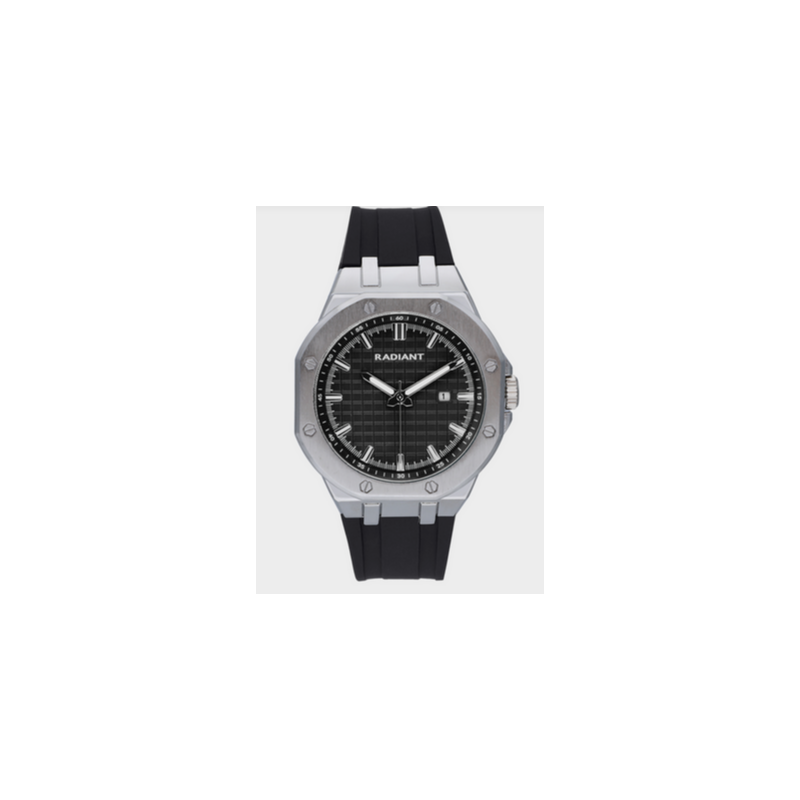 Reloj Radiant Caballero Leonardo Correa Silicona Negra Caja Metálica Plateado Esfera Negra 44mm Ref: RA652202